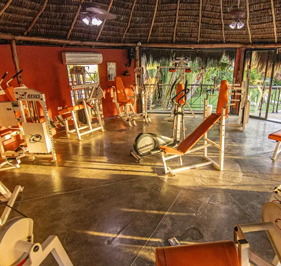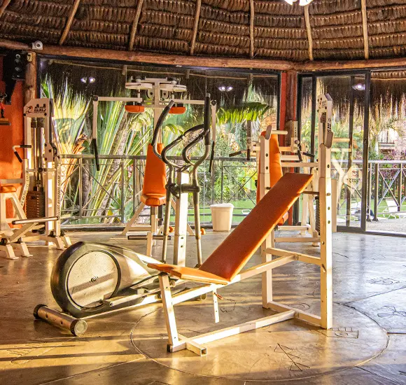 Mantenga su ritmo y energía en un espacio diseñado para inspirar. Nuestro gimnasio, ubicado bajo una majestuosa churuata, le permite ejercitarse en un ambiente fresco y original con vista a nuestros jardines.